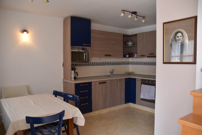 V pritličju so kuhinja, jedilnica, kopalnica in dnevna soba. Kuhinja je sodobno opremljena, ima hladilnik pečico, pomivalni stroj, mikrovalovno pečico, kavni aparat in ostale majhne gospodinjske aparate, s katerimi celo peka torte na počitnicah ne bo več nemogoč izziv. V dnevni sobi je udoben kavč, s katerega lahko gledamo televizijo s satelitskim priključkom ali ob dežju zakurimo ogenj v kaminu, ki stoji v kotu sobe.